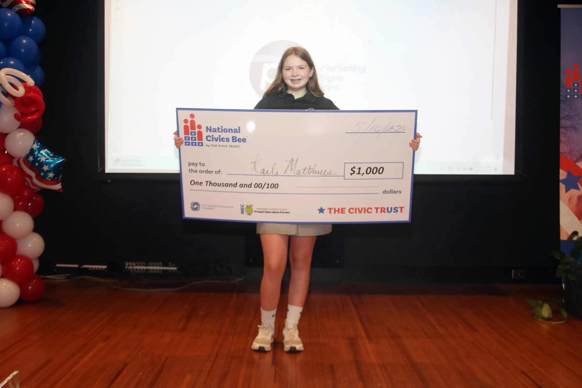 She will represent the state as one of 27 finalists at the National Civics Bee Championship, to be held in Washington, D.C., November 10–11, 2025.
