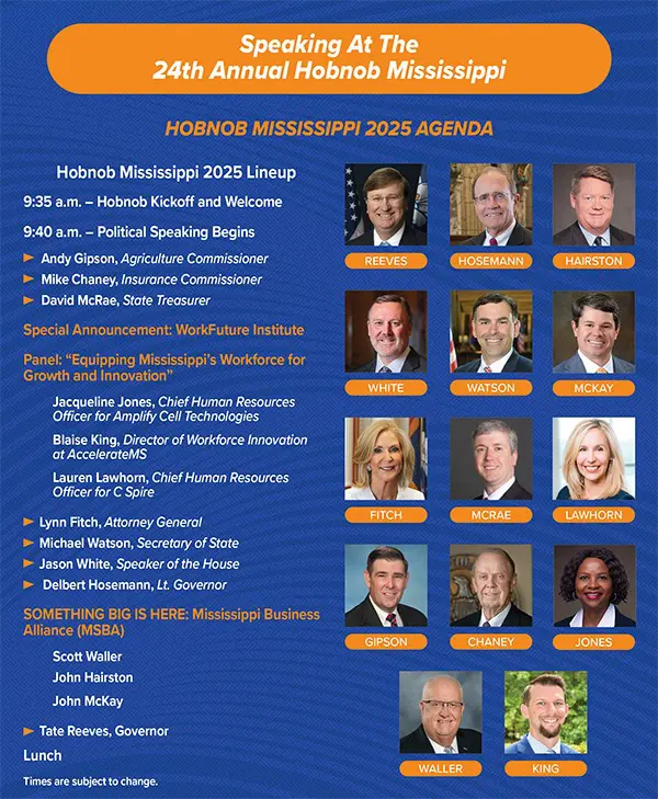 Please be sure to attend Hobnob Mississippi to hear from statewide elected officials and learn about the great things happening with economic development and workforce in Mississippi. There will also be an update on Business Alignment 2026 - soon to be the Mississippi Business Alliance.